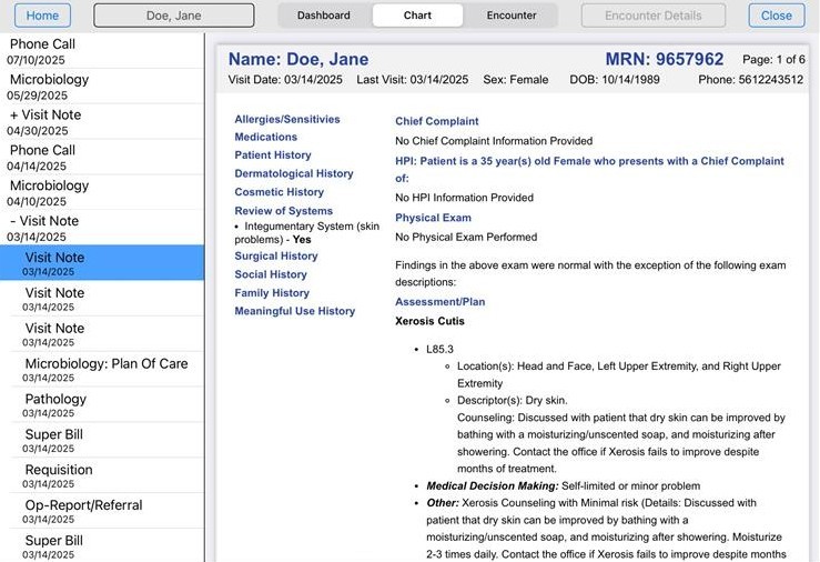 eDerm has all the features you need in a dermatology EHR – and nothing extra that you don’t need, so it’s easy to learn and easy to use. eDerm makes dermatology electronic medical records simple with a complete dermatological library and the dermatology workflow to make every encounter quicker and more efficient than ever before.