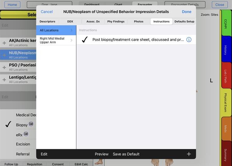 eDerm’s Save as Default feature simplifies everything from descriptors to differential diagnosis (DDX) and patient instructions. You simply select the impression and the impression details will already be documented and patient instructions are ready to print. It’s that simple!